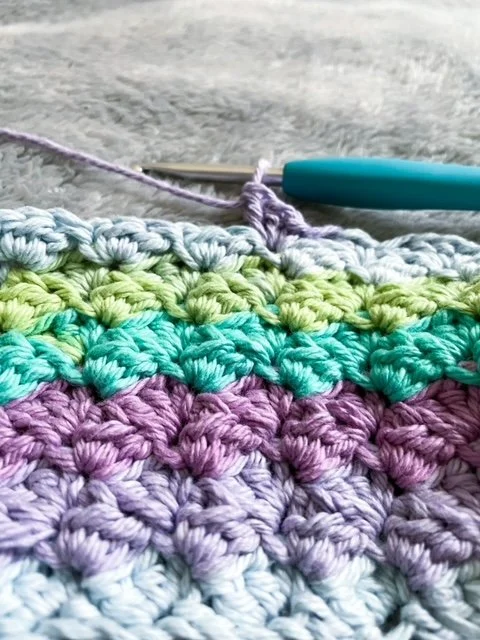 Row 1: Starting in the 3rd ch from the hook, hdc & dc (first two chains count as first sc so place stitch marker at top of ch 2), *skip two chains then (sc, hdc, dc) all in the 3rd st* repeat * to * 7 more times. You should be left with 3 ch, skip 2 ch, and then sc in the last chain, turn (10 sc [including ch 2], 9 hdc, 9 dc: 28 total sts [including ch 2]